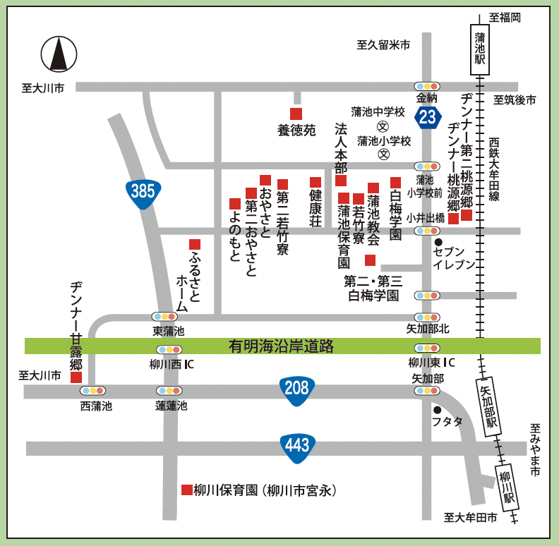 西鉄大牟田線 柳川駅下車 車10分西鉄大牟田線 蒲池駅下車 徒歩15分九州自動車道 八女インター 車30分